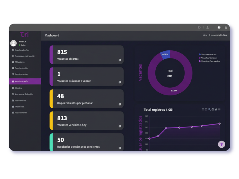 Con TRI centralizamos todo tu proceso de selección en una sola plataforma. Desde la publicación de vacantes hasta la firma de contrato, cada módulo está impulsado por Inteligencia Artificial para optimizar tiempos, reducir errores y mejorar la experiencia tanto de reclutadores como de candidatos.