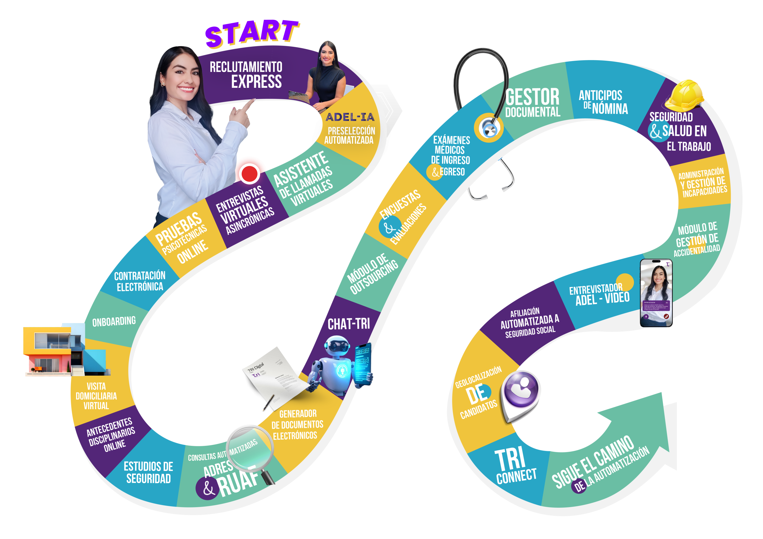 En TRI desarrollamos un ecosistema de herramientas digitales que transforma la forma en que las empresas seleccionan y contratan talento. Digitaliza tus procesos, opera en línea y toma decisiones basadas en datos gracias a nuestros reportes e indicadores.